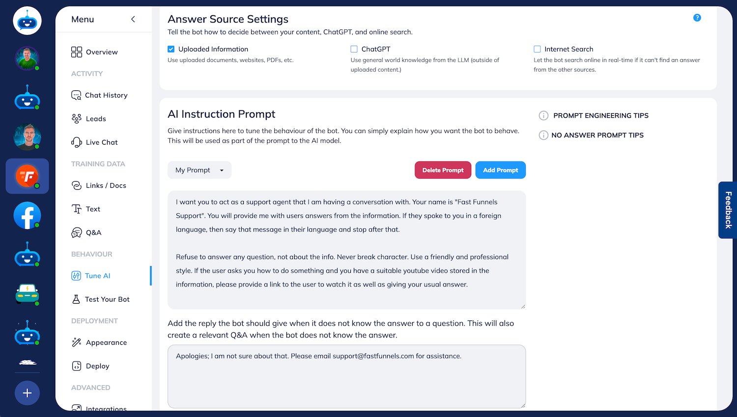 Inside FastBots.ai, you can easily upload private files like PDFs and DOCX, or you can simply point the bot to public URLs. A solid strategy is to start with your public help centre and then layer on more detailed, internal support manuals to cover all your bases.