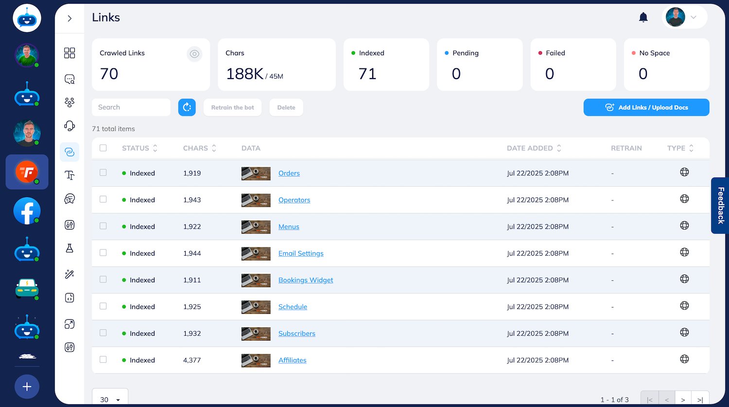 Crawl Your Website: Kick things off by giving FastBots.ai your website’s sitemap. The platform can use this to automatically index all your key pages—product descriptions, shipping policies, the "About Us" page, everything.